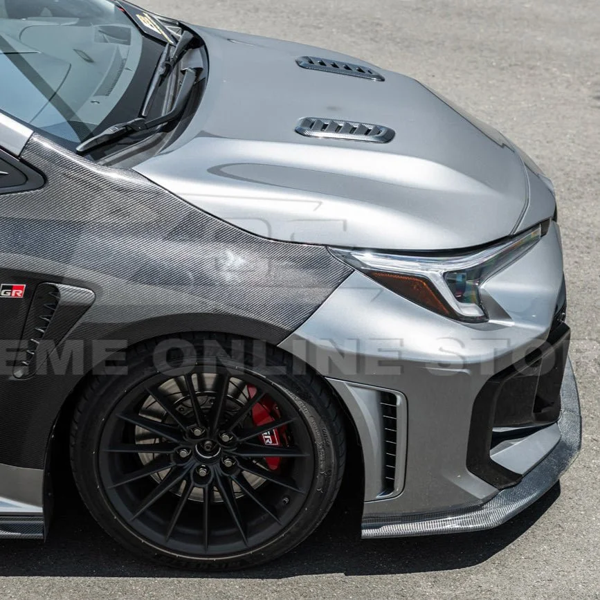 Each splitter is hand-finished for a mirror-like carbon weave pattern that adds visual depth and luxury to your GR Corolla’s front end. The fitment follows OEM specifications for a factory-like installation that requires no cutting or modification. The durable clear-coated finish helps protect against UV rays, moisture, and road debris, maintaining that high-gloss look for years.